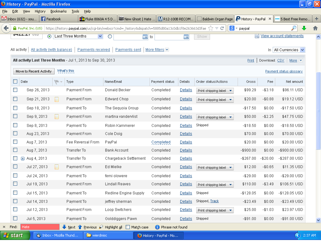 ALSO there are RUMORS spread by Jack apparently that I received some PARTIAL REFUND! THIS IS INCORRECT. Here is the entire paypal record screen shotted from my computer (on months when fortunately I was on vacation a lot and thus not taking many orders. So it's easy to see the relevant information. WHich is that I was charged back 267.00 PLUS a 20 dollar fee from paypal! THen paypal realizing I'd been hosed...gave back the 20. Swell. Here's that SCREEN SHOT THINK ABOUT IT FOLKS. What MOTIVE would I have to ALIENATE a potential GOOD CUSTOMER over what? I offered to give him the other contacts at my loss for 50.00 to replace those lost. Why on earth would I alienate a potentially good customer running a synth repair business over 50 bucks EVEN IF I WAS CROOKED! THat's insane!